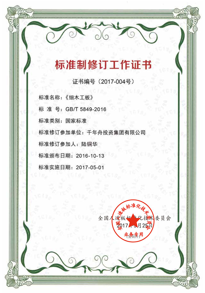 标准制修订工作证书一细木工板