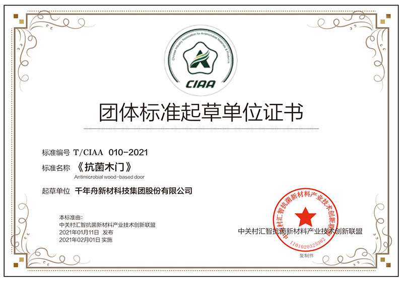 《木门》团体标准起草单位证书